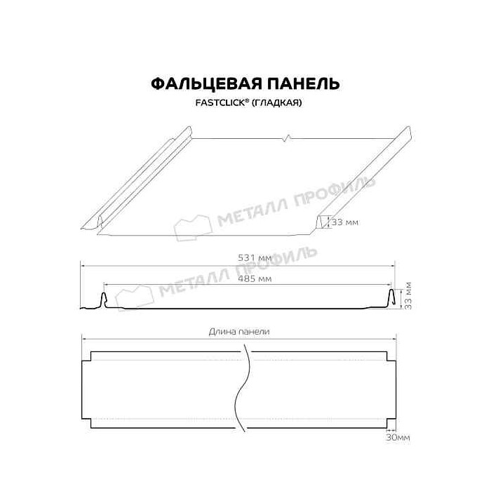 Что касается габаритов, то Фальцевая панель Металл Профиль FASTCLICK (VikingMP E-20-RR32-0.5) отличается удобными параметрами: лёгкую картину шириной 531 мм удобно монтировать, а замки высотой 33 мм обеспечивают плотное соединение. Длину панели можно выбрать, она варьируется от 0,5 до 12 метров.