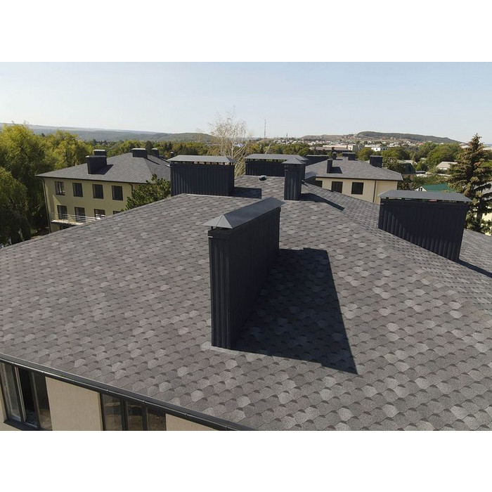 Благородный графитовый цвет подчеркивает эффектную овальную форму лепестков. Гонты создают эффект морской волны, а затемненные участки делают покрытие объемным. Черепица сочетается с нейтральными светлыми и оригинальными яркими фасадами.