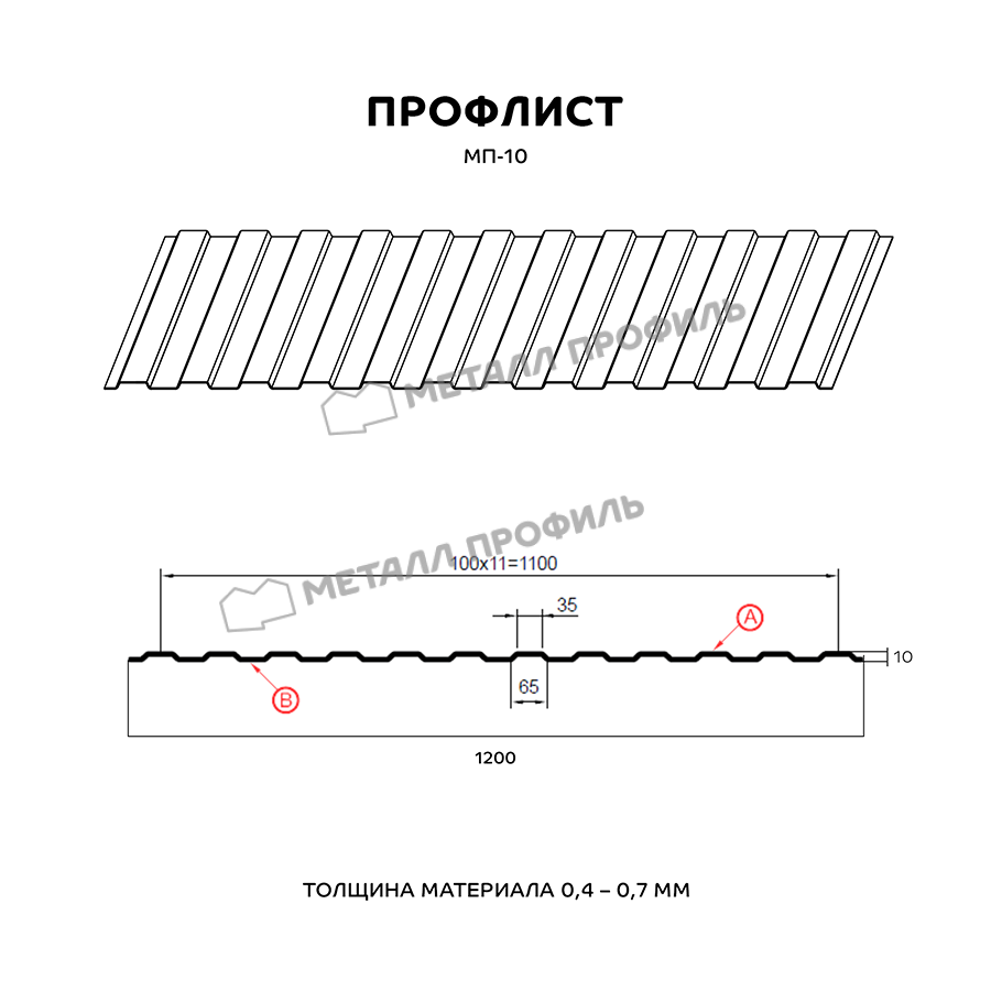 МП-10 – разновидность стандартного стенового профлиста. Он замечательно подходит в виде декоративного ограждения, подвесного потолка в нежилых помещениях, стенового материала, забора, вентилируемого фасада. Профлист характеризуется трапециевидной формой гребня, идентичной на сторонах А и В. Глубина волны – 10 мм, что не придаёт материалу высокой несущей способности, но при оформлении стен это не столь важно. В то же время лаконичный рельеф поверхности не придаёт зданию суровый облик. На технические качества можно повлиять, выбрав ту или иную толщину стальной основы. Этот профиль прокатывается в вариациях от 0,4 до 0,7 мм. Повысить защиту от ржавчины способен финишный полимерный слой. Покрытие не только отличается богатым цветом, стойким к выгоранию на солнце, но и предупредит мелкие физические дефекты и корродирование стали.