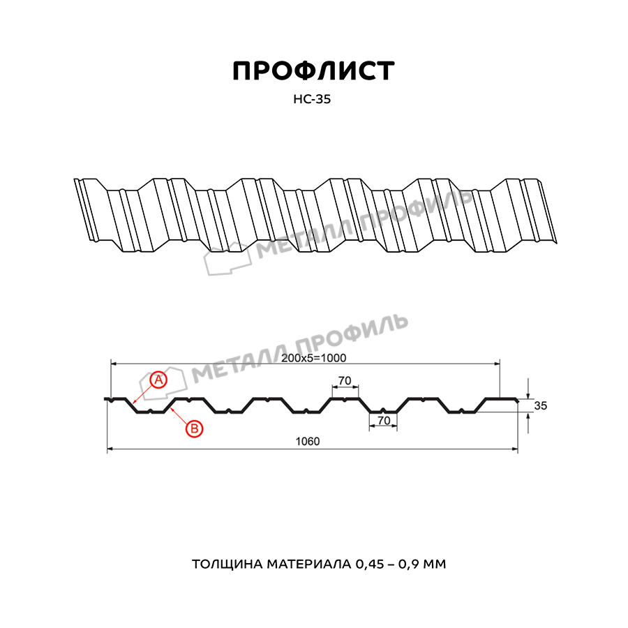 Многофункциональный и выгодный материал с симметричным профилем. Маркировка НС означает, что профилированный лист является и «несущим», и «стеновым». Он пользуется спросом как при строительстве частных домов, так и для индустриальных объектов. С помощью профнастила с высотой волны в 35 мм получаются строения абсолютно разного назначения: каркасные здания ( цеха, торговые центры, склады ), ограждения придомовых и общественных территорий, обустройство кровли, быстровозводимые сооружения ( павильоны, навесы ). Хорошую способность выдерживать нагрузки НС-35 придают дополнительные желобки, которые расположены с обеих сторон профлиста. Полезная ширина материала достигает 1000 мм при номинальной ширине 1060 мм, то есть при монтаже данного профиля в боковой замок уйдёт 60 мм. Толщина металлопроката имеет диапазон от 0,5 до 0,9 мм – это влияет не только на механическую стойкость профнастила, но и его вес. Полимерное покрытие из ассортимента Компани Металл Профиль добавит профлисту дополнительную стойкость к ржавению и ультрафиолету.