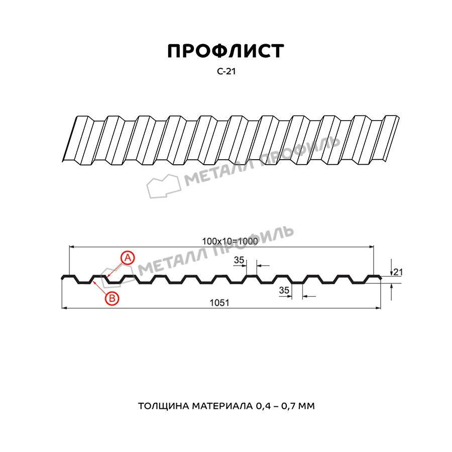 Профнастил с пометкой С-21 означает, что это «стеновой» вариант с высотой волны 21 мм. На самом деле, С-21 является универсальным металлопрокатом, который применяется не только для фасадов. Он будет уместен как для обшивки стен, так и для монтажа кровли, возведения заборов. С успехом С-21 находит применение при создании складских помещений, быстровозводимых зданий, торговых павильонов, а также в качестве элемента сэндвич-панелей. С-21 станет прекрасным выбором в качестве стройматериала для Профилированного листа. Для этого он обладает хорошей несущей способностью. Расположенные на небольшом расстоянии друг от друга трапециевидные волны придают ему необходимую жёсткость. А симметричный рельеф гофры, одинаковый с обеих сторон, придаёт Профилированному листу гармоничный облик. В зависимости от назначения, мы изготовим профиль С-21 в различной толщине металла от 0,4 до 0,7 мм. Для повышения срока эксплуатации и внешней привлекательности, профлист изготавливается в полимерных покрытиях различных цветов и фактур, включая покрытия под кирпич, дерево, камень.